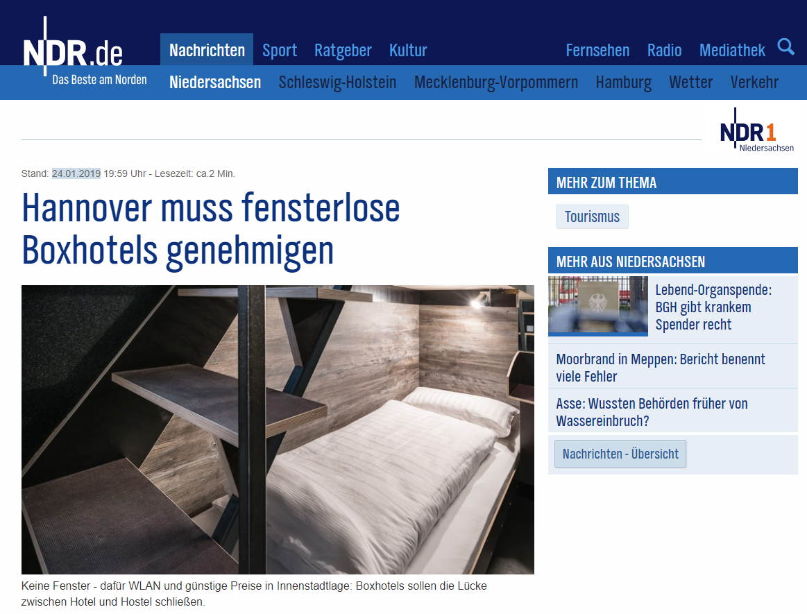 20190124_NDR.de_Hannover muss fensterlose Boxhotels genehmigen Kommentar verfassen / Von Doreen Becher / Februar 2, 2019 Zeitungsartikel über das Hotel